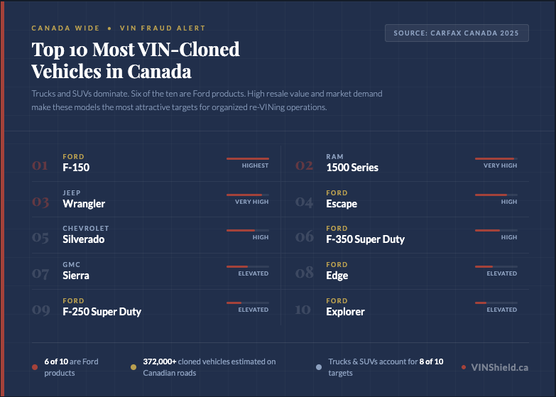 Not all vehicles carry equal risk. CARFAX Canada's data on the top 10 most VIN-cloned vehicles in Canada is dominated by trucks and SUVs: